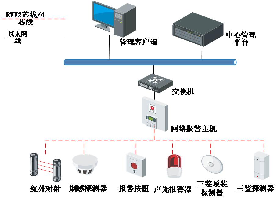 緊急報(bào)警按鈕、紅外雙鑒探測器、煙感探測器等前端報(bào)警采集設(shè)備通過RVV2芯/ RVV4芯線纜接入部署在機(jī)房的報(bào)警主機(jī)。